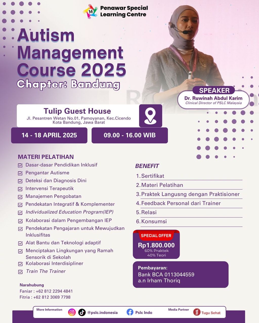 Bergabunglah dalam pelatihan eksklusif yang akan dibawakan oleh trainer dari Penawar Special Learning Centre, Malaysia, yang akan membahas berbagai aspek terkait manajemen individu dengan autisme.